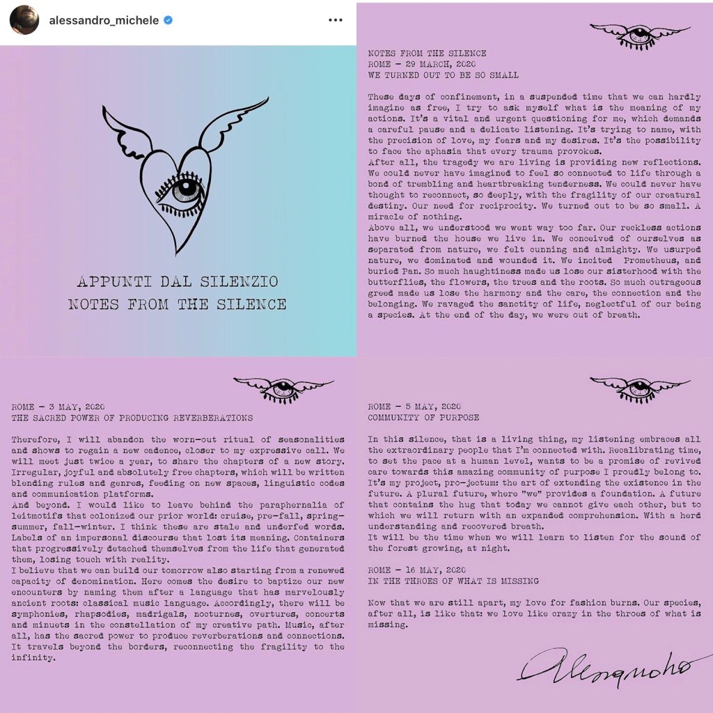 Então, em uma carta aberta em sua conta pessoal do Instagram, o diretor criativo Alessandro Michele expõe seu desejo de quebrar este ciclo e se renovar. Seguem trechos em tradução livre:
